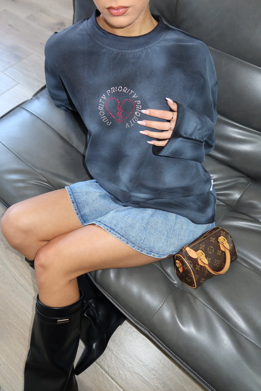 Priority strass shirt: PRIORITY RHINESTONE LONGSLEEVE – Zwart (Washed Black)