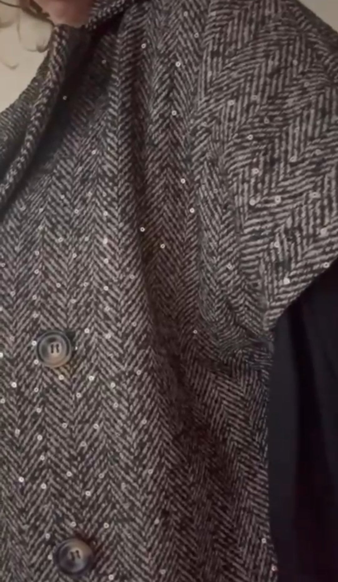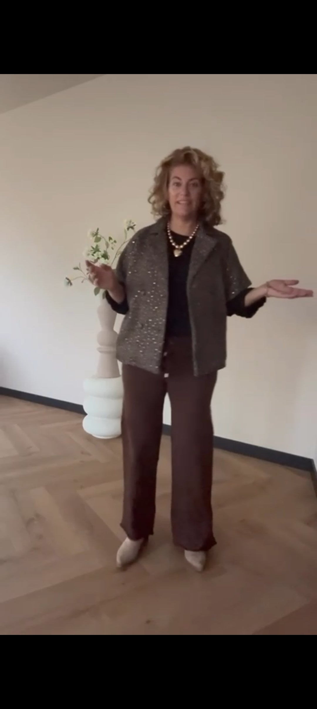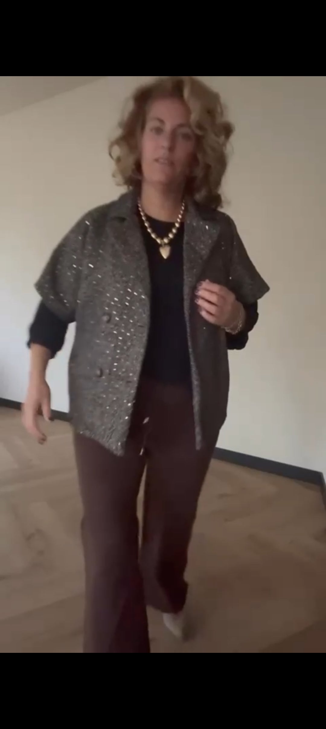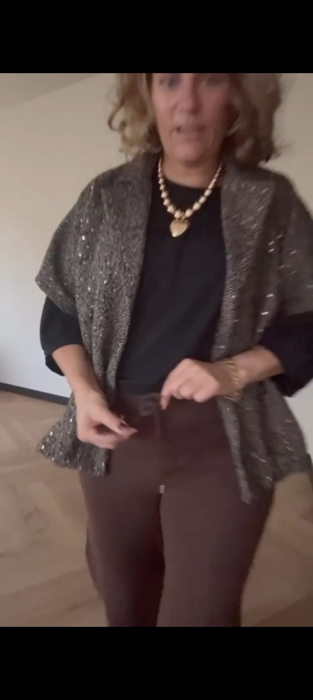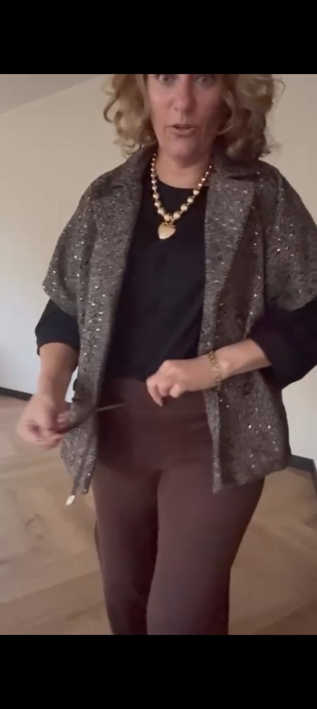 Korte tussenjas dames/ mouwloos vest met kleurloze lovertjes en visgraat patroon - Bruin | Fall4me collectie 2.0